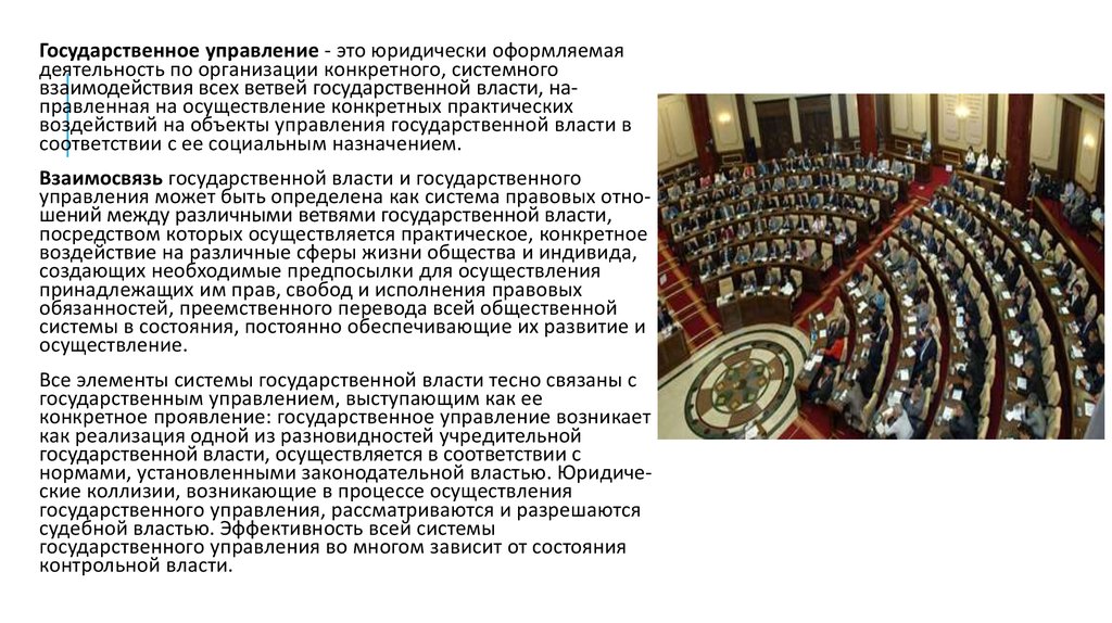 Государственное управление - это юридически оформляемаядеятельность по организации конкретного, системного