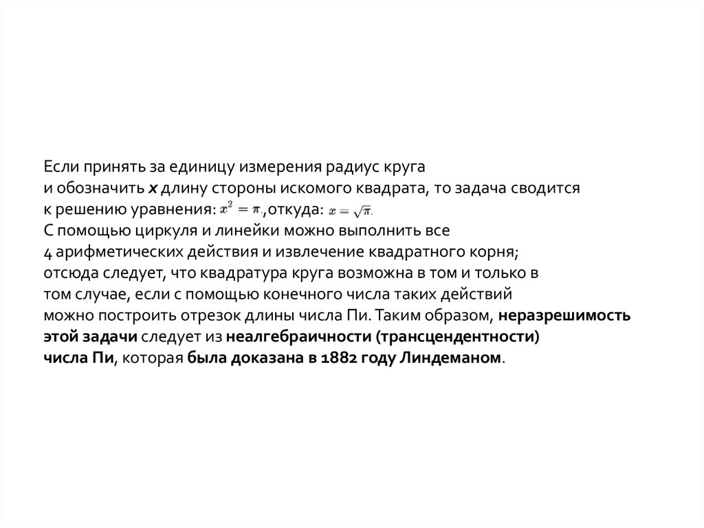 неразрешимости квадратуры круга дал в 1882 году Линдеман.