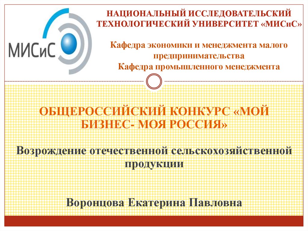 1. НАЦИОНАЛЬНЫЙ ИССЛЕДОВАТЕЛЬСКИЙ ТЕХНОЛОГИЧЕСКИЙ УНИВЕРСИТЕТ «МИСиС» Кафедра экономики и менеджмента малого предпринимательства