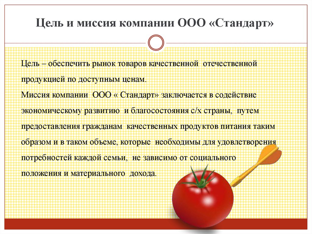 Цель и миссия компании ООО «Стандарт»Цель – обеспечить рынок товаров качественной отечественной