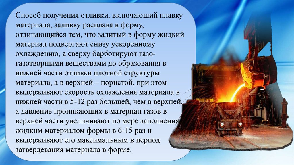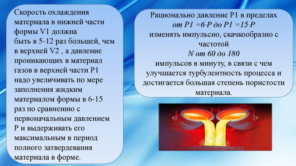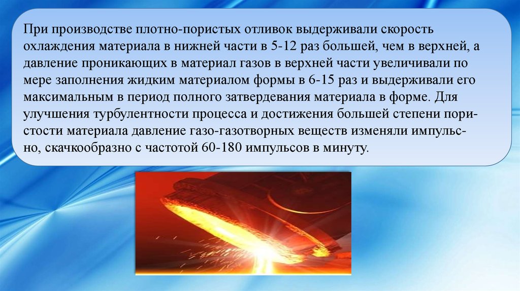 При производстве плотно-пористых отливок выдерживали скоростьохлаждения материала в нижней части в 5-12 раз большей, чем в верхней, а