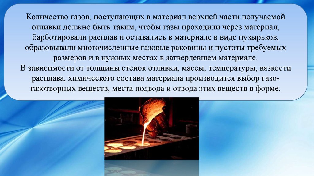 расплава, химического состава материала производится выбор газогазотворных веществ, места подвода и отвода этих веществ в форме.