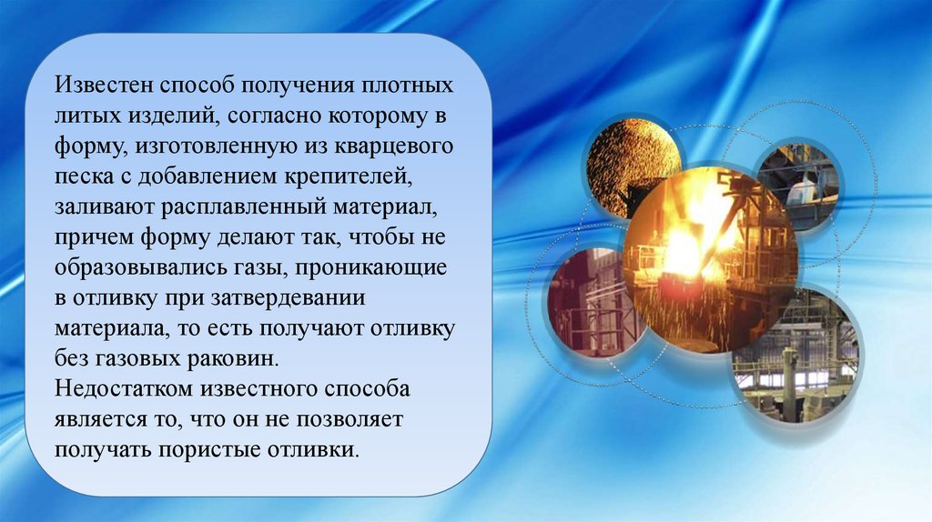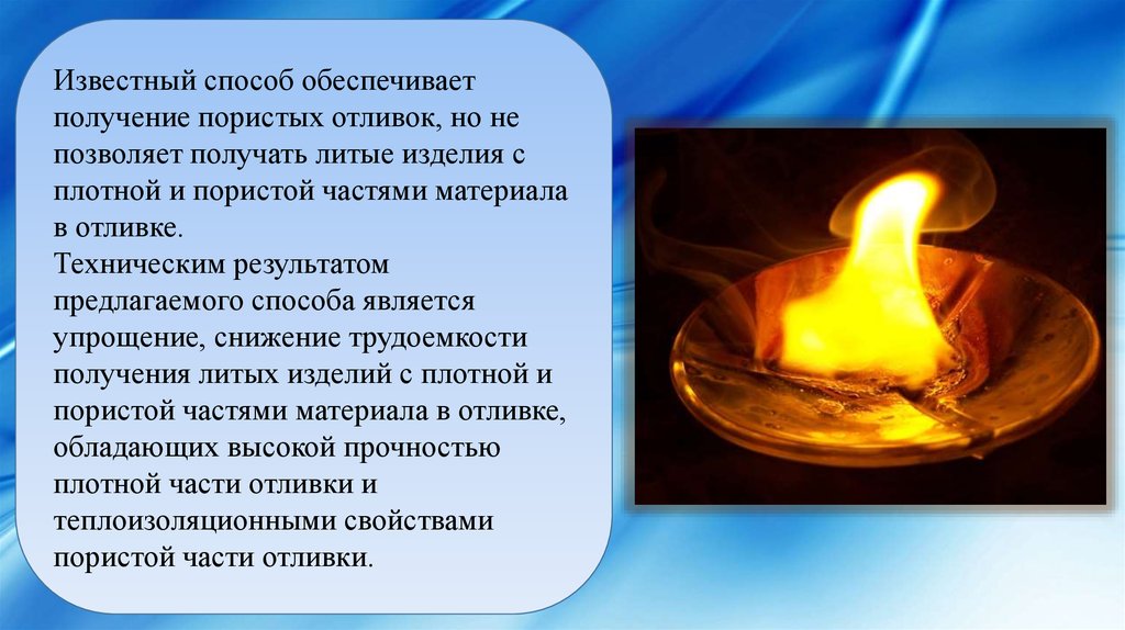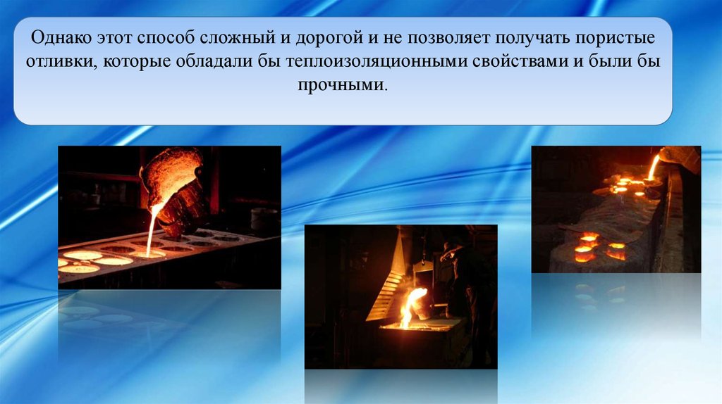 Однако этот способ сложный и дорогой и не позволяет получать пористыеотливки, которые обладали бы теплоизоляционными свойствами и были бы