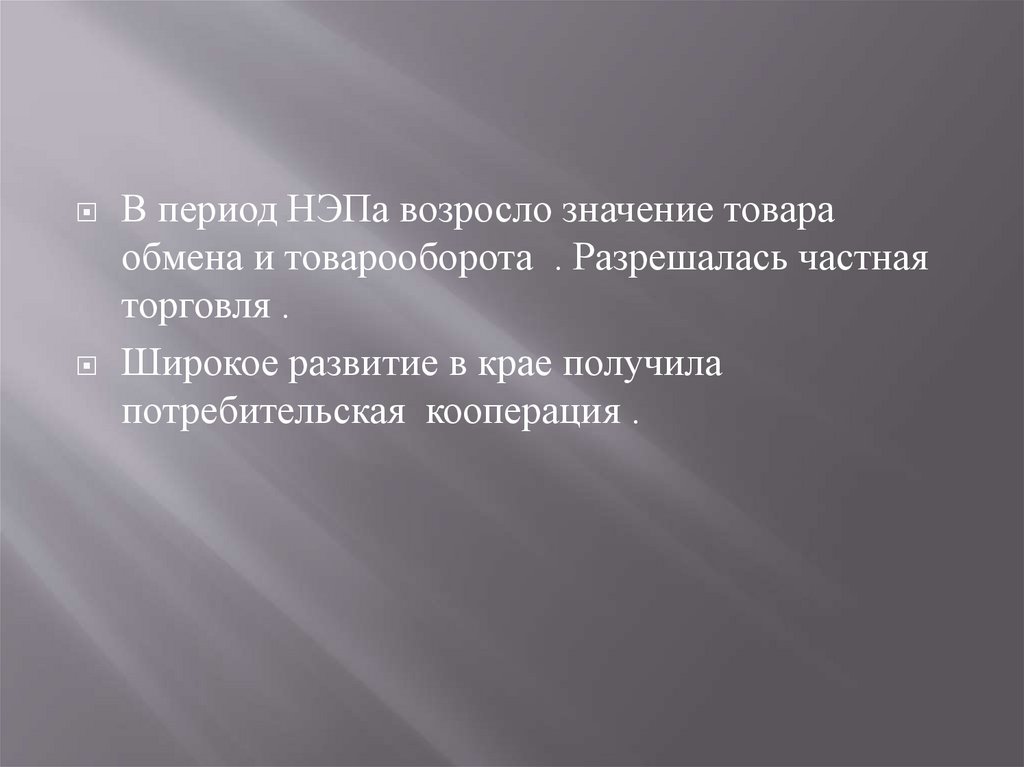В период НЭПа возросло значение товараобмена и товарооборота . Разрешалась частная