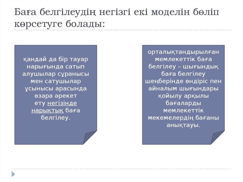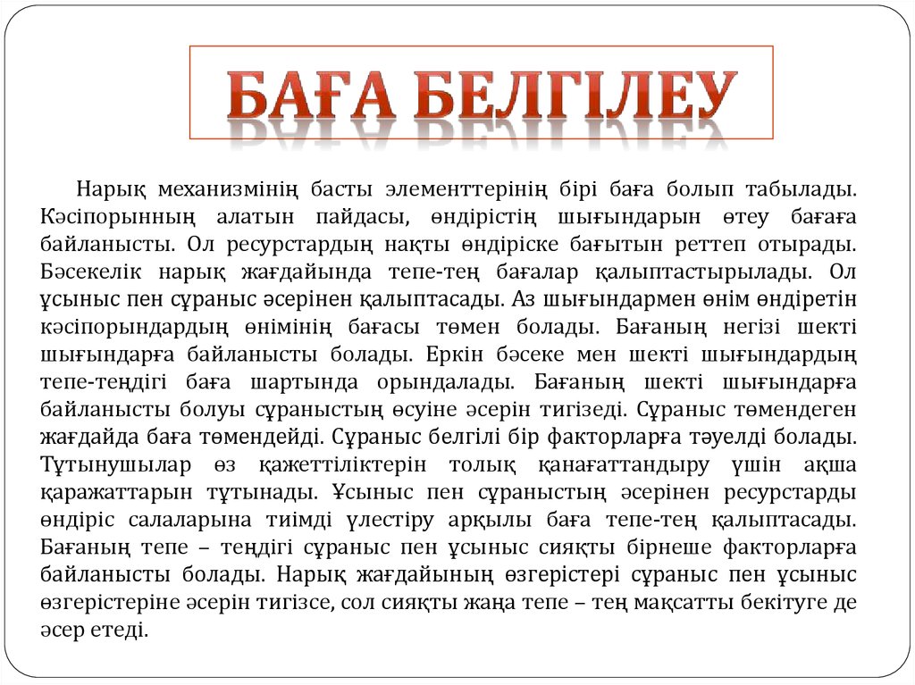 Нарық механизмінің басты элементтерінің бірі баға болып табылады.Кәсіпорынның алатын пайдасы, өндірістің шығындарын өтеу бағаға