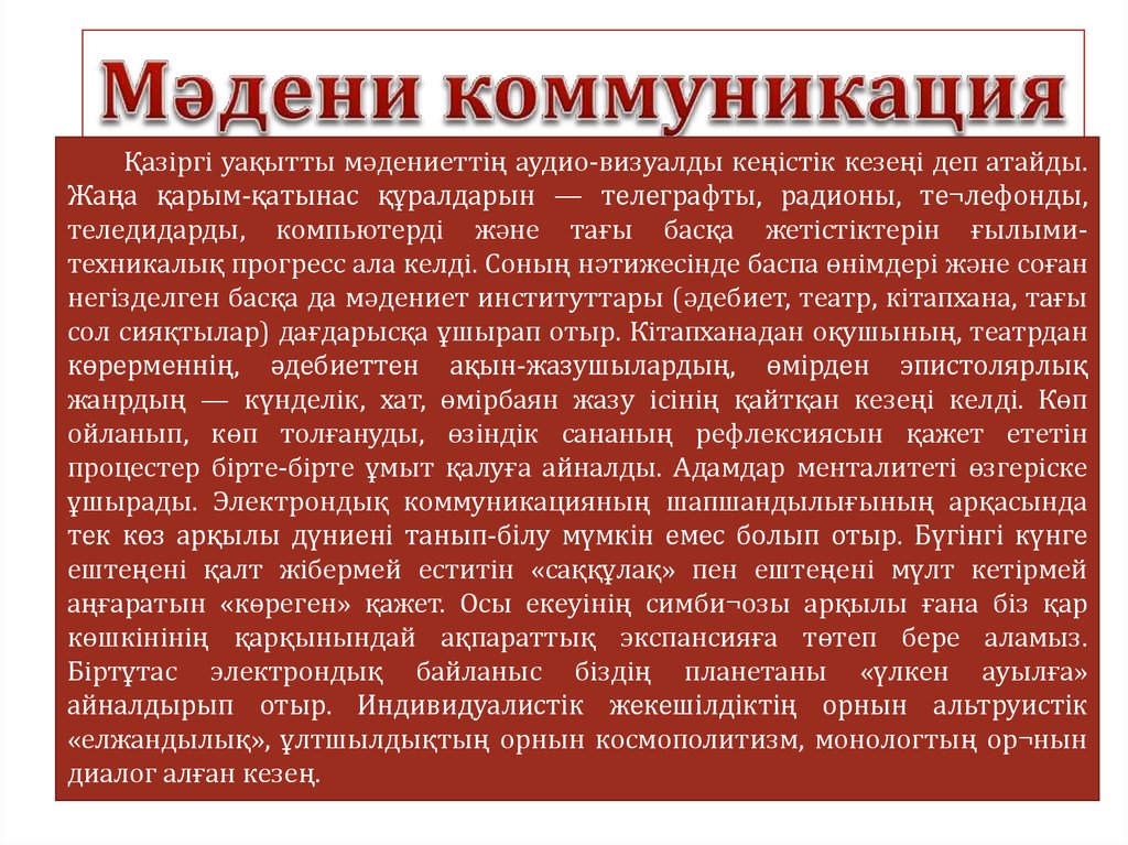 Қазіргі уақытты мәдениеттің аудио-визуалды кеңістік кезеңі деп атайды.Жаңа қарым-қатынас құралдарын — телеграфты, радионы, те¬лефонды,