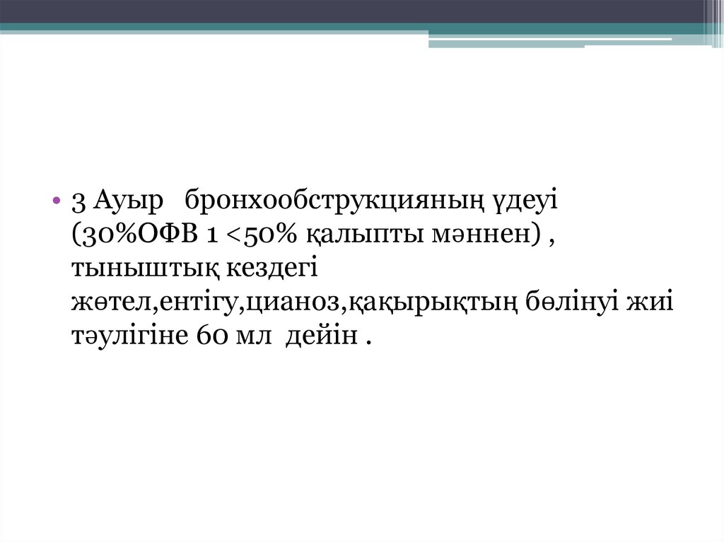 • 3 Ауыр бронхообструкцияның үдеуі(30%ОФВ 1 <50% қалыпты мәннен) ,