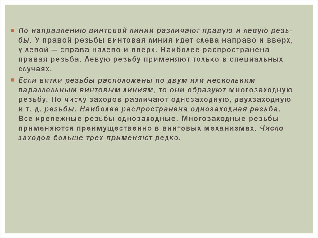 По направлению винтовой линии различают правую и левую резьбы. У правой резьбы винтовая линия идет слева направо и вверх,у левой — справа налево и вверх. Наиболее распрос транена