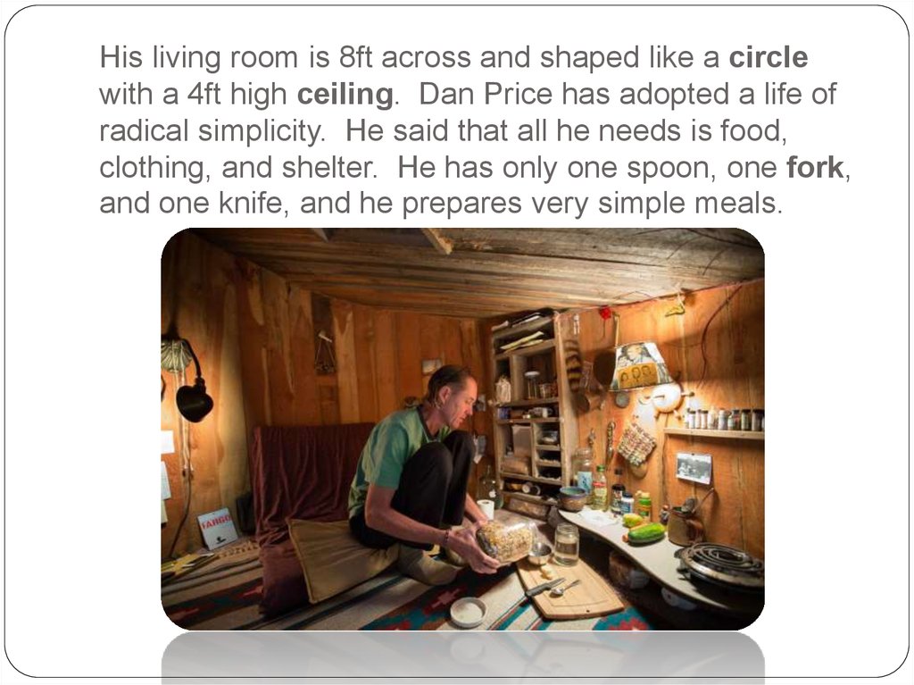 Living in a "hobbit hole"2. This is Dan Price. He lives on only $5000 a year. He lives in an underground “hobbit hole” that he built from scrap wood. He