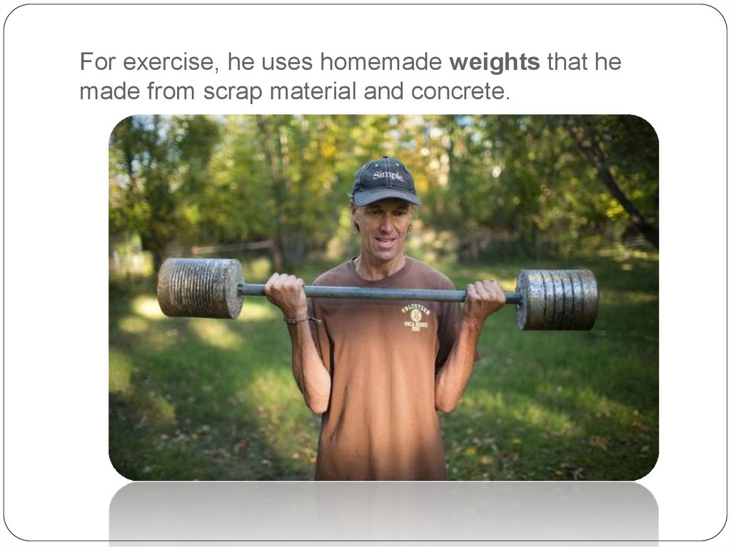 6. For exercise, he uses homemade weights that he made from scrap material and concrete.