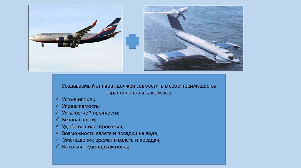 Создаваемый аппарат должен совместить в себе преимуществаэкранопланов и самолетов.