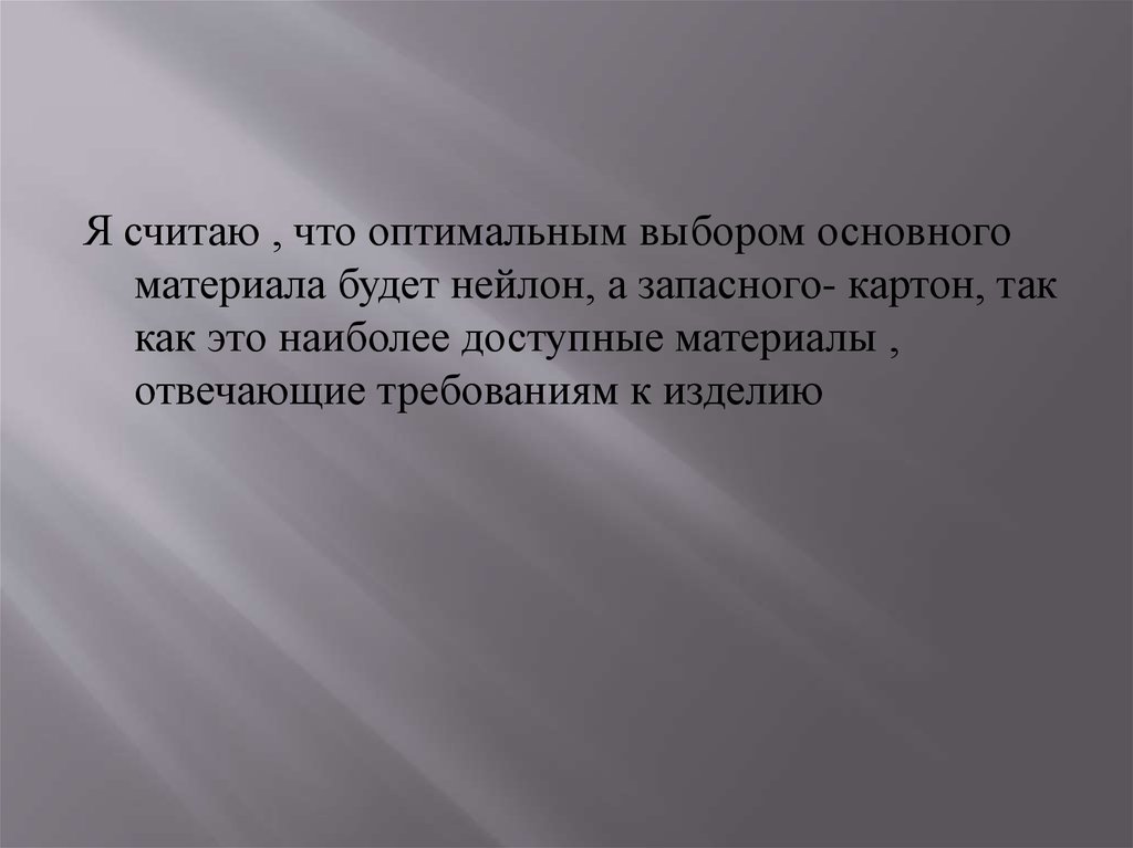 Я считаю , что оптимальным выбором основногоматериала будет нейлон, а запасного- картон, так