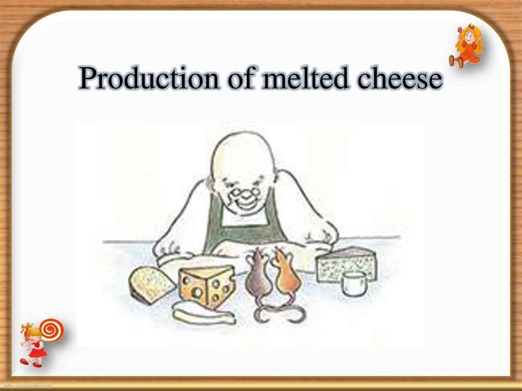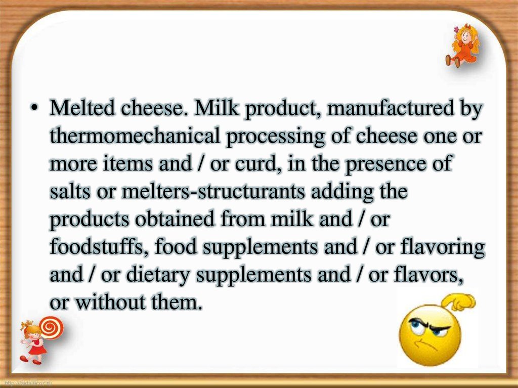 • Melted cheese. Milk product, manufactured bythermomechanical processing of cheese one or