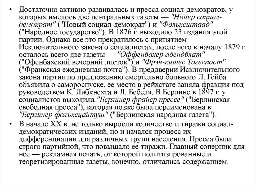 • Достаточно активно развивалась и пресса социал-демократов, укоторых имелось две центральных газеты — "Нойер социалдемократ" ("Новый социал-демократ") и "Фолькештаад"