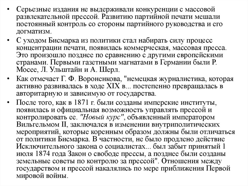 • Серьезные издания не выдерживали конкуренции с массовойразвлекательной прессой. Развитию партийной печати мешали