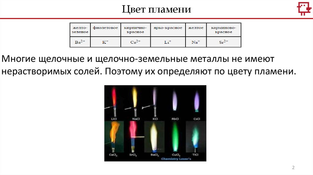 Цвет пламениМногие щелочные и щелочно-земельные металлы не имеют