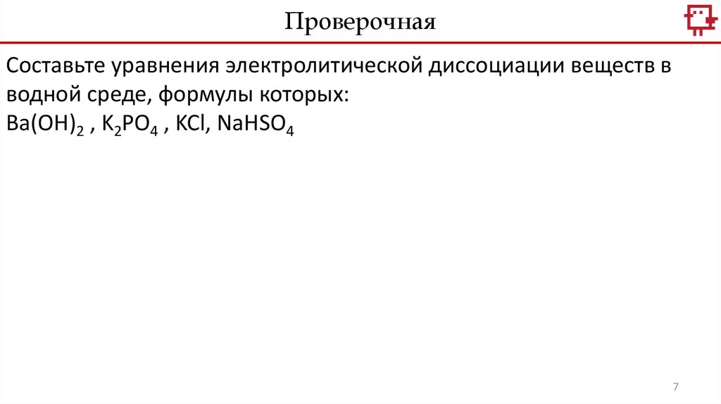 ПроверочнаяСоставьте уравнения электролитической диссоциации веществ в