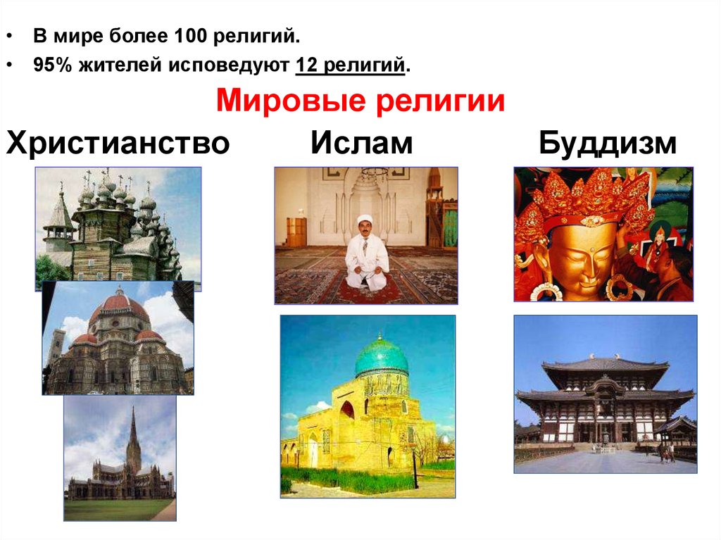 • В мире более 100 религий.• 95% жителей исповедуют 12 религий.