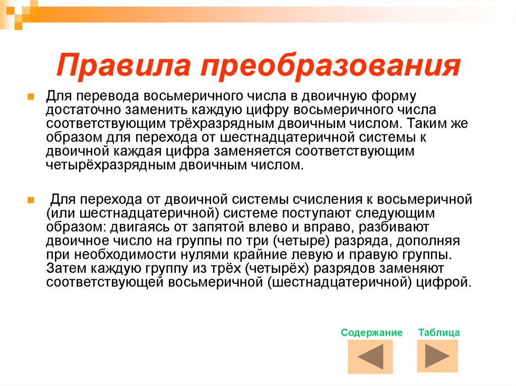 Правила преобразованияДля перевода восьмеричного числа в двоичную форму