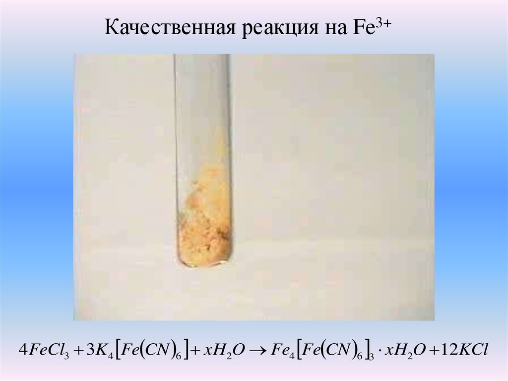 Качественная реакция на Fe3+4FeCl3 3K 4 Fe CN 6 xH2O Fe4 Fe CN 6 3 xH2O 12KCl