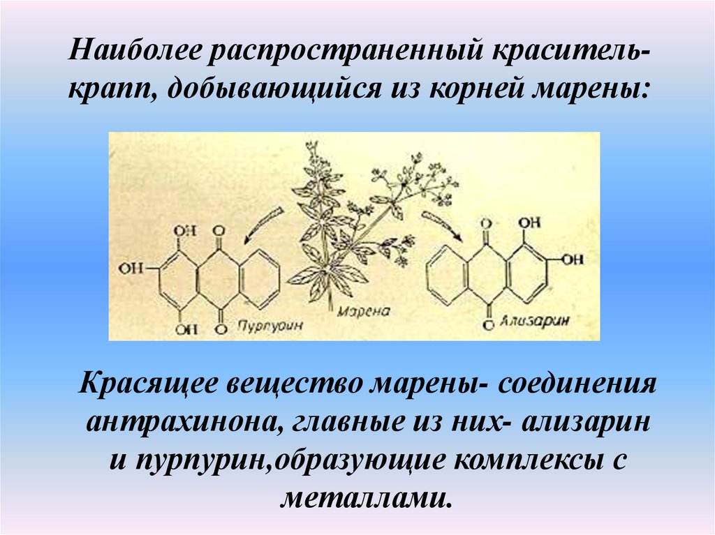 Наиболее распространенный красителькрапп, добывающийся из корней марены:Красящее вещество марены- соединения