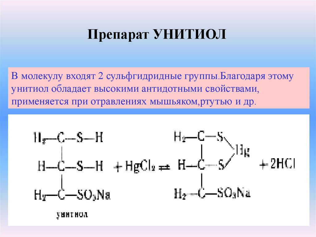 Препарат УНИТИОЛВ молекулу входят 2 сульфгидридные группы.Благодаря этому