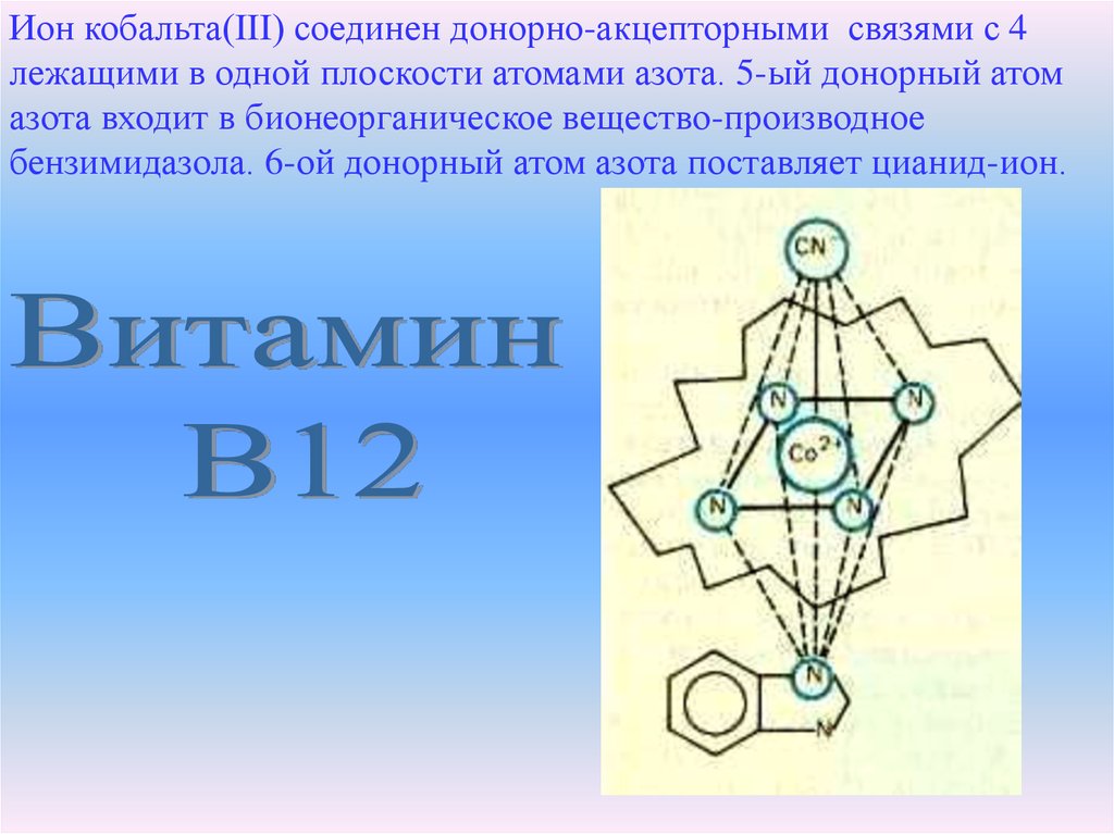 Ион кобальта(III) соединен донорно-акцепторными связями с 4лежащими в одной плоскости атомами азота. 5-ый донорный атом