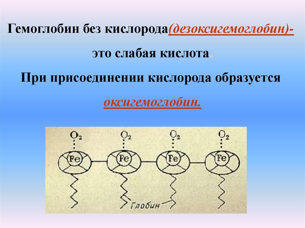 Гемоглобин без кислорода(дезоксигемоглобин)это слабая кислота.При присоединении кислорода образуется
