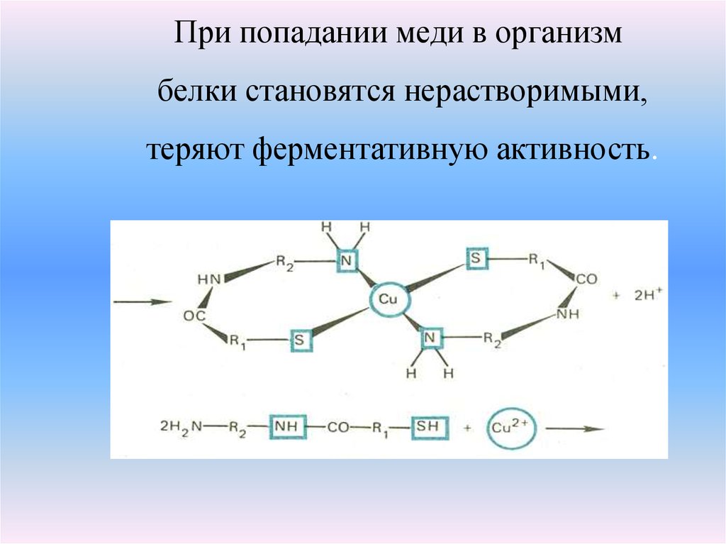 При попадании меди в организмбелки становятся нерастворимыми,