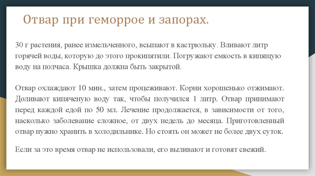 Отвар при геморрое и запорах.30 г растения, ранее измельченного, всыпают в кастрюльку. Вливают литр