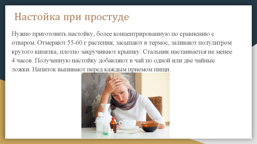 Настойка при простудеНужно приготовить настойку, более концентрированную по сравнению с