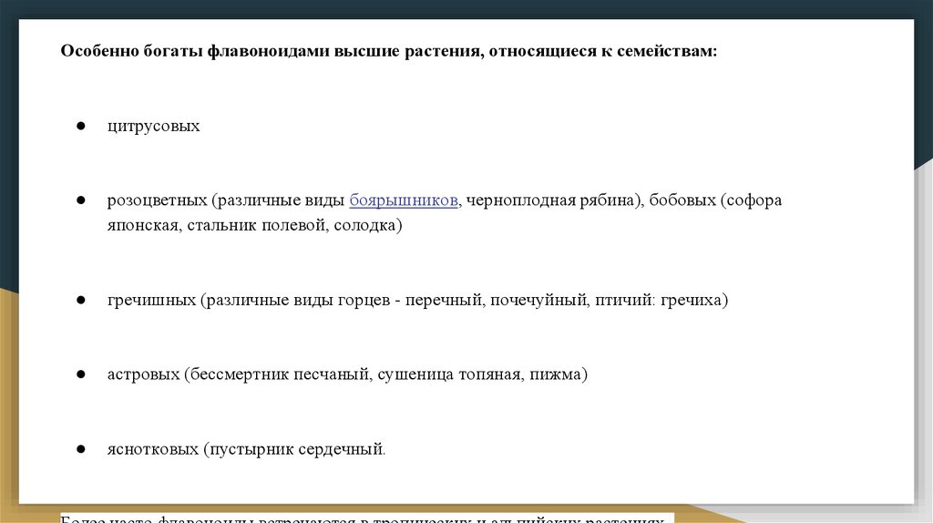 Особенно богаты флавоноидами высшие растения, относящиеся к семействам:цитрусовых