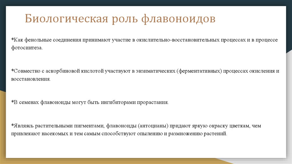 Биологическая роль флавоноидов*Как фенольные соединения принимают участие в окислительно-восстановительных процессах и в процессе