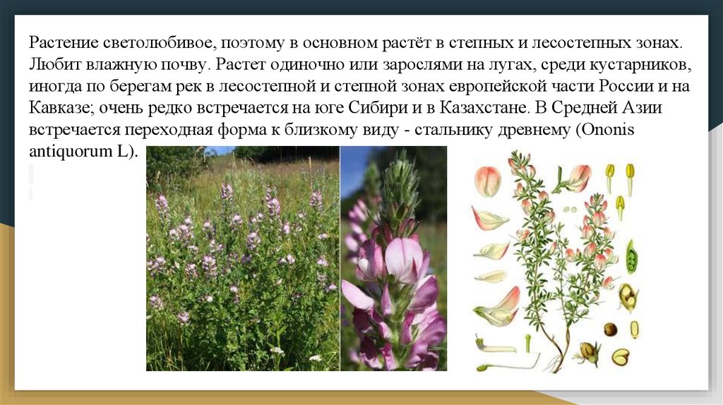 встречается переходная форма к близкому виду - стальнику древнему (Ononis