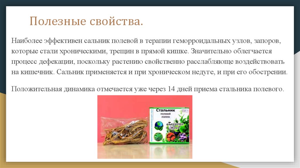 Полезные свойства.Наиболее эффективен сальник полевой в терапии геморроидальных узлов, запоров,