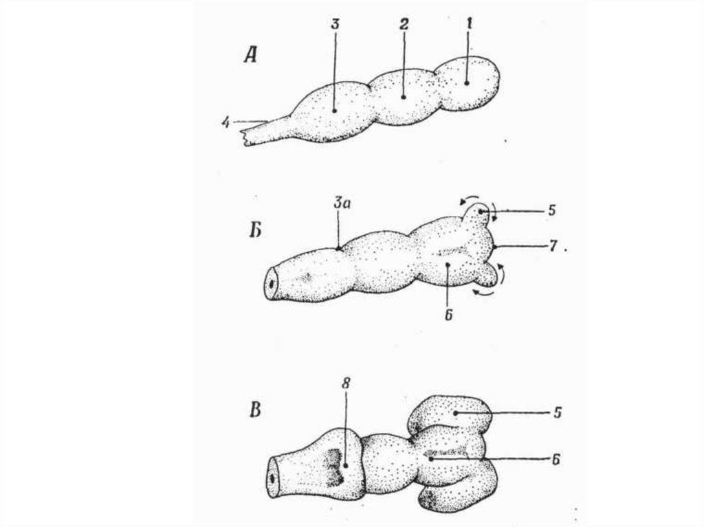 Рис. 158. Развитие ромбовидного мозга, развертывание нервной трубки (схема)А — поперечный разрез нервной трубки, Б — поперечный разрез ромбовидного мозга (развертывание нервной