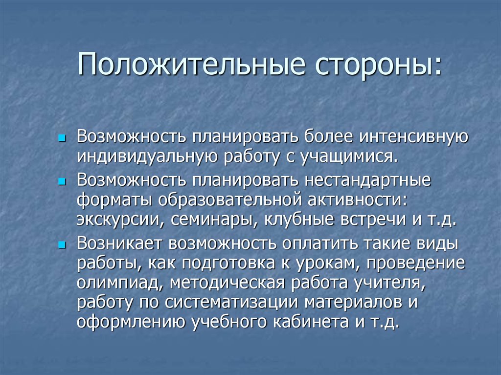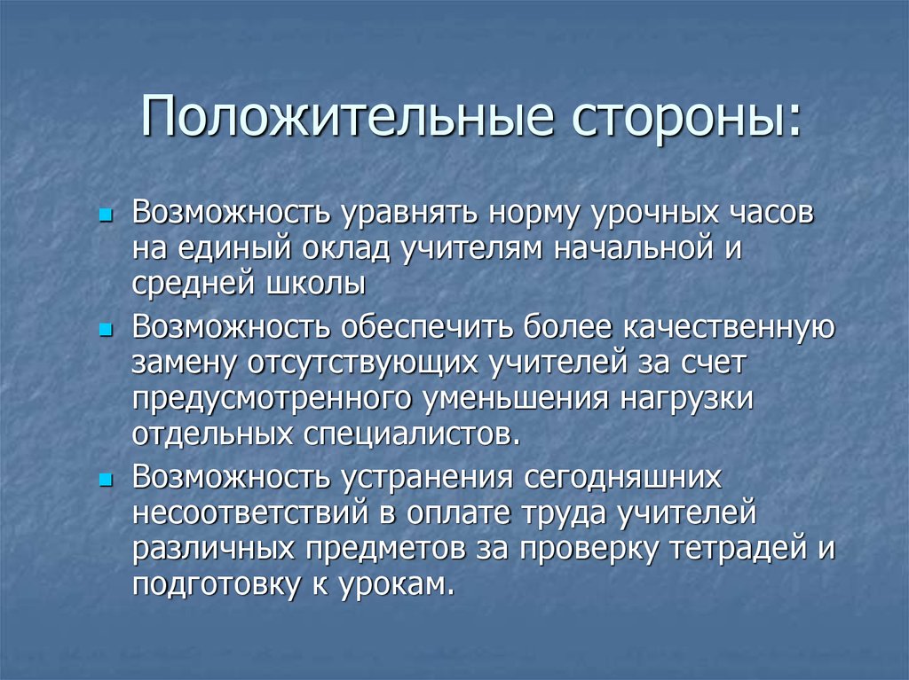 Положительные стороны:Возможность уравнять норму урочных часов