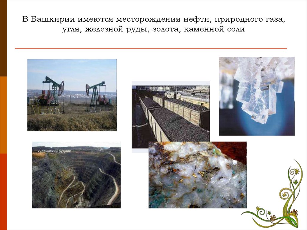 В Башкирии имеются месторождения нефти, природного газа,угля, железной руды, золота, каменной соли