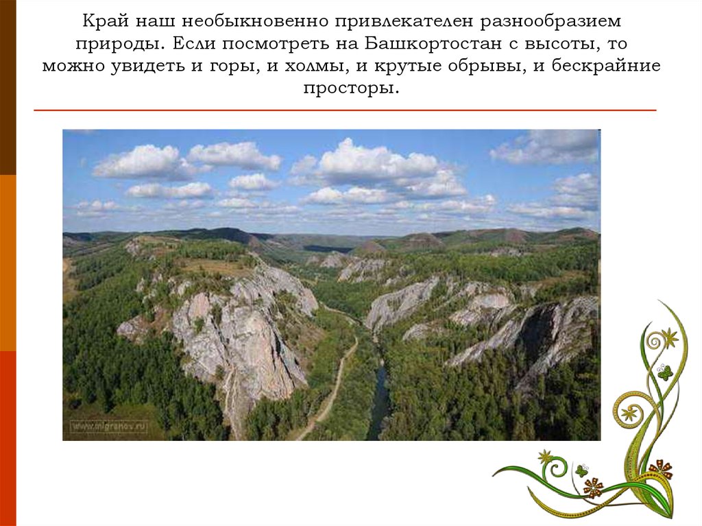 Край наш необыкновенно привлекателен разнообразиемприроды. Если посмотреть на Башкортостан с высоты, то