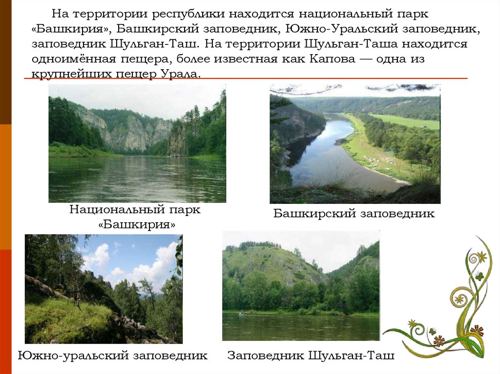 На территории республики находится национальный парк«Башкирия», Башкирский заповедник, Южно-Уральский заповедник,