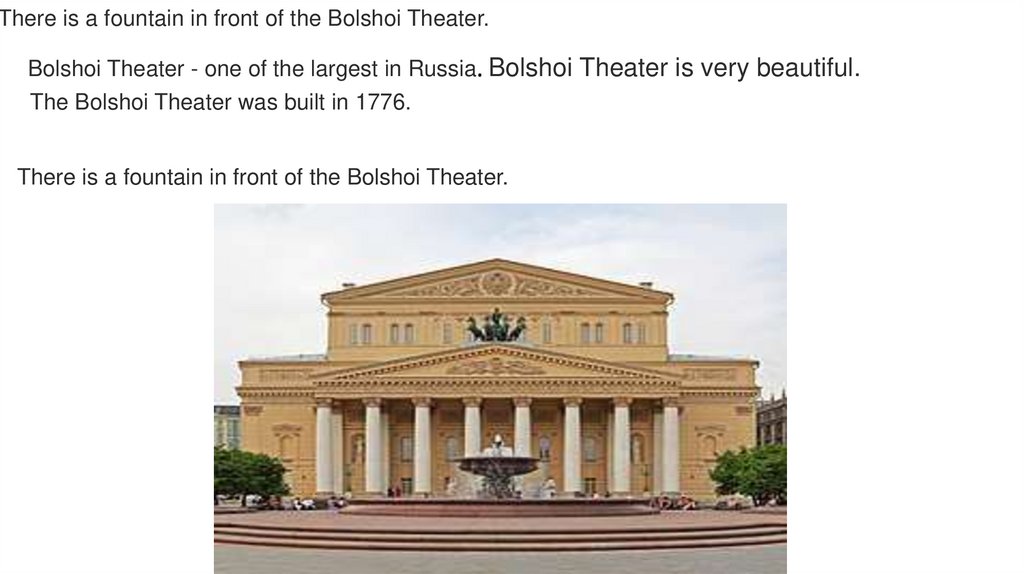 There is a fountain in front of the Bolshoi Theater.Bolshoi Theater - one of the largest in Russia. Bolshoi Theater is very beautiful.