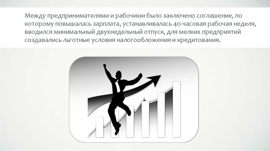 Между предпринимателями и рабочими было заключено соглашение, покоторому повышалась зарплата, устанавливалась 40-часовая рабочая неделя,