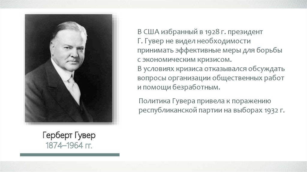 В США избранный в 1928 г. президентГ. Гувер не видел необходимости
