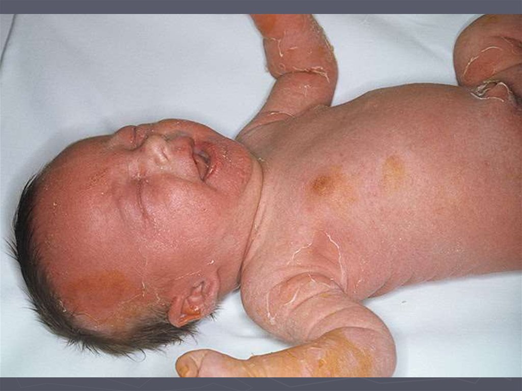Высыпания в виде окруженных розовым венчикомпузырей по всему телу, за исключением ладоней и