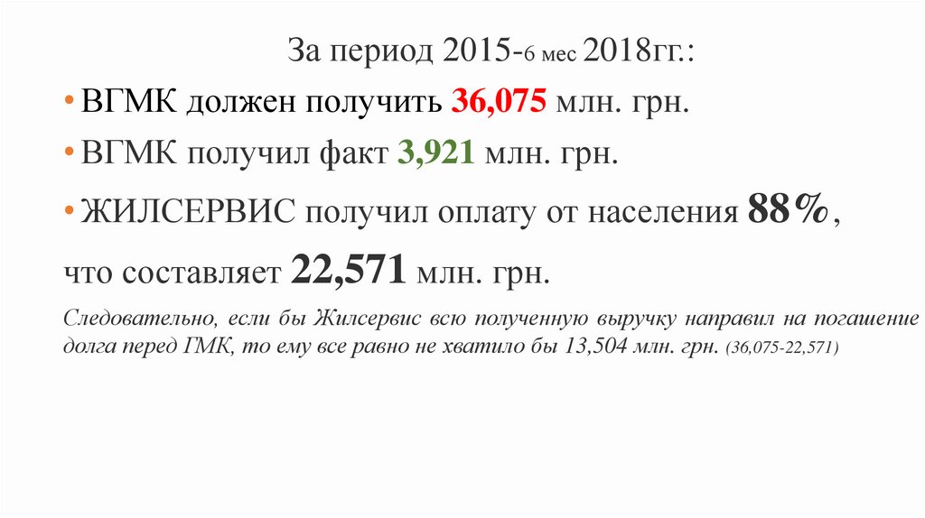 За период 2015-6 мес 2018гг.:• ВГМК должен получить 36,075 млн. грн.
