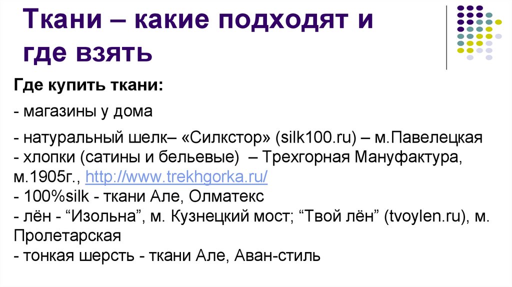 - лён - “Изольна”, м. Кузнецкий мост; “Твой лён” (tvoylen.ru), м.