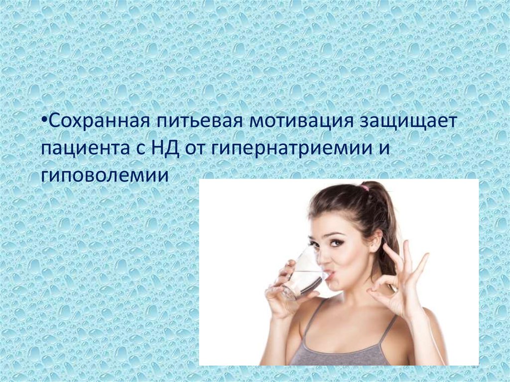 •Сохранная питьевая мотивация защищаетпациента с НД от гипернатриемии и