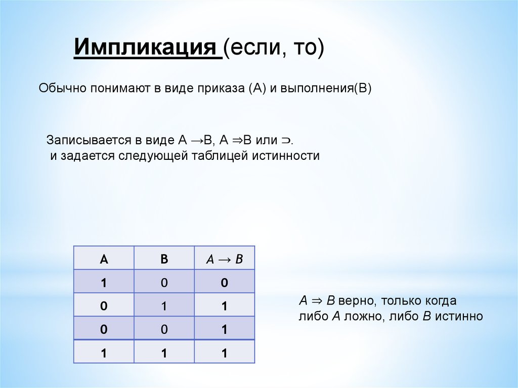 Импликация (если, то)Обычно понимают в виде приказа (А) и выполнения(В)
