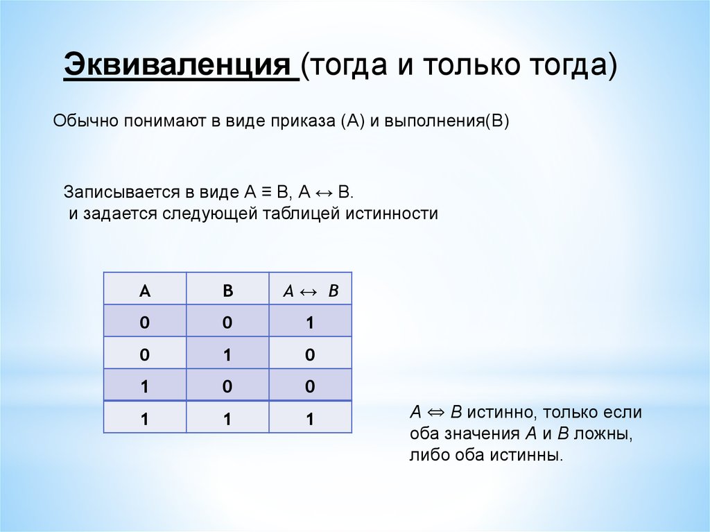 Эквиваленция (тогда и только тогда)Обычно понимают в виде приказа (А) и выполнения(В)