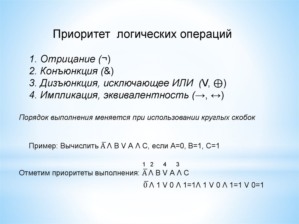 Пример: Вычислить Аഥ Ʌ В V А Ʌ С, если А=0, В=1, С=1